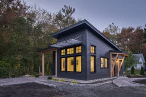 The clients found Unity by researching energy-efficient and net-zero builders that also offered small house designs. Ellen and Rich fell in love with the look of Unity’s Zum platform, and that clinched their decision to work with Unity. Because Unity didn’t offer a Zum that was small enough to meet the ADU size limit (800sf max), we worked with the clients under a Personalized design contract to create a “Zumette” that would fit the bill. Needless to say, Rich and Ellen were thrilled when we collectively arrived at a creative solution that would allow them to live in their dream home.