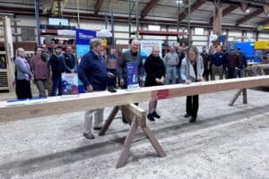 Regardless of the final application, all our panels start in the shop as simple raw lumber. Our lumber stays indoors at our facility, protected from the elements, ensuring our pieces stay straight and dry. As seen in the photos below, our lumber is incredibly long. This extra length is the result of a manufactured wood product from Nordic. Its origins are in the heartwood of rapidly growing black spruce trees. The smaller selections of wood combine into a finger-jointed glulam product, which is very straight and highly durable.