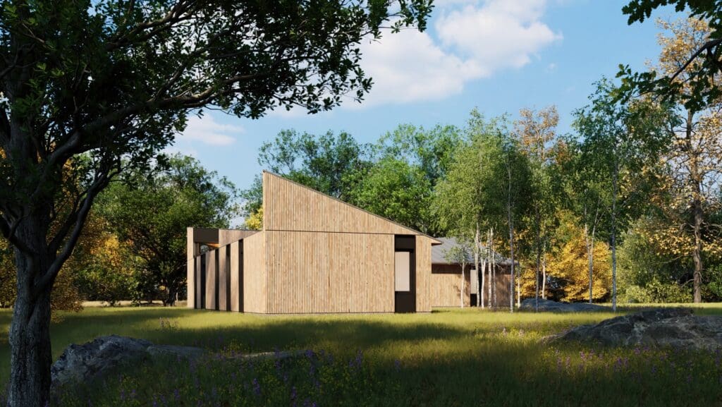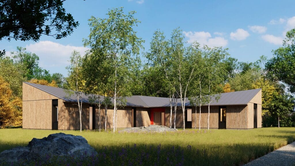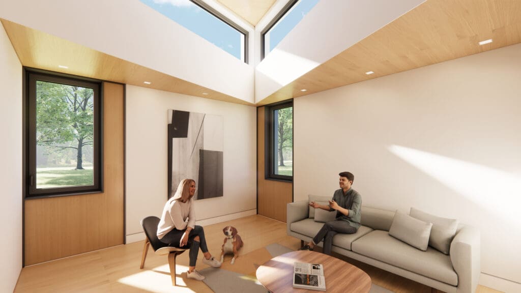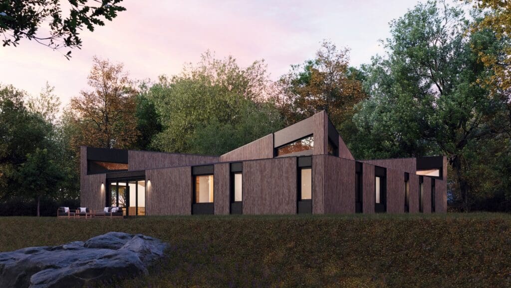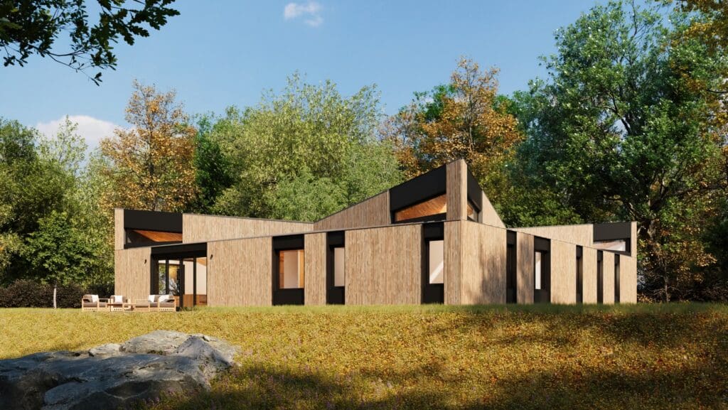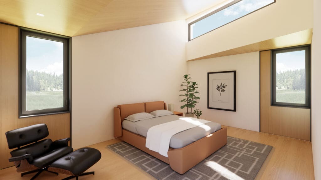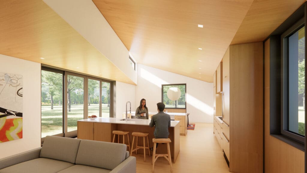 The Ell plan is spacious and expansive in its single-story layout. The geometric simplicity of the plan has two perpendicular bars that distinguish the communal spaces from the private organized around a central outdoor entry court and orients the home in two directions creating a unique relationship with the defining features of your site. Expressed at the exterior by dramatic triangular clerestory windows, the origami-shaped roof creates a dynamic light filled and airy interior with views to the landscape throughout the home.