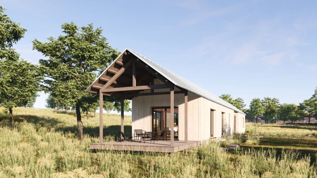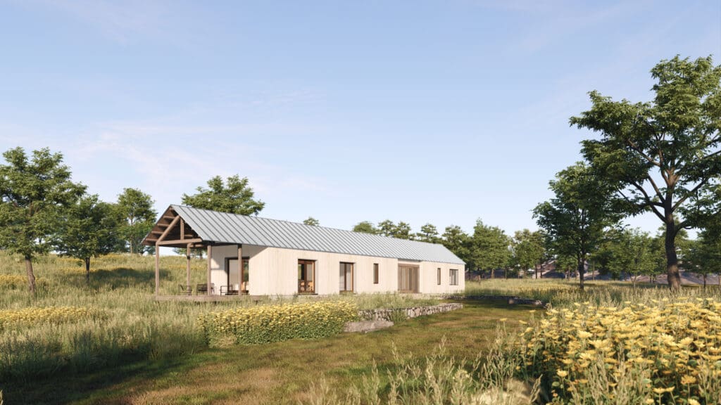 Divided between public and private areas by a ‘dog run’ (or breezeway), this simple gable form includes an open and vaulted living/kitchen space with an exposed timber frame structure, and a large primary bedroom with vaulted ceilings and a dressing room. The narrow footprint of the building allows for ample daylight and effective cross-ventilation. The sheltered porch off the living room is a place to gather and watch the seasons change.