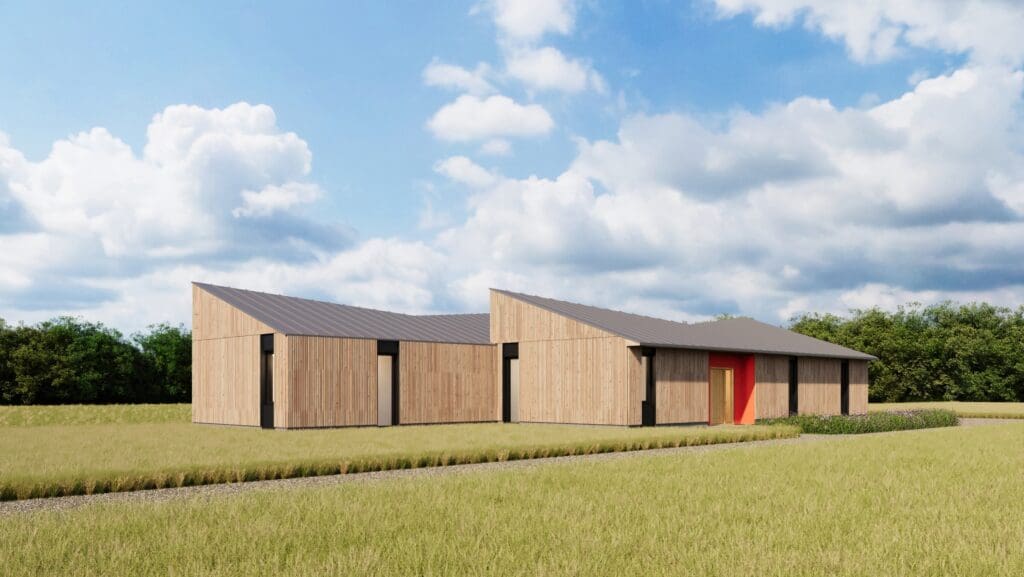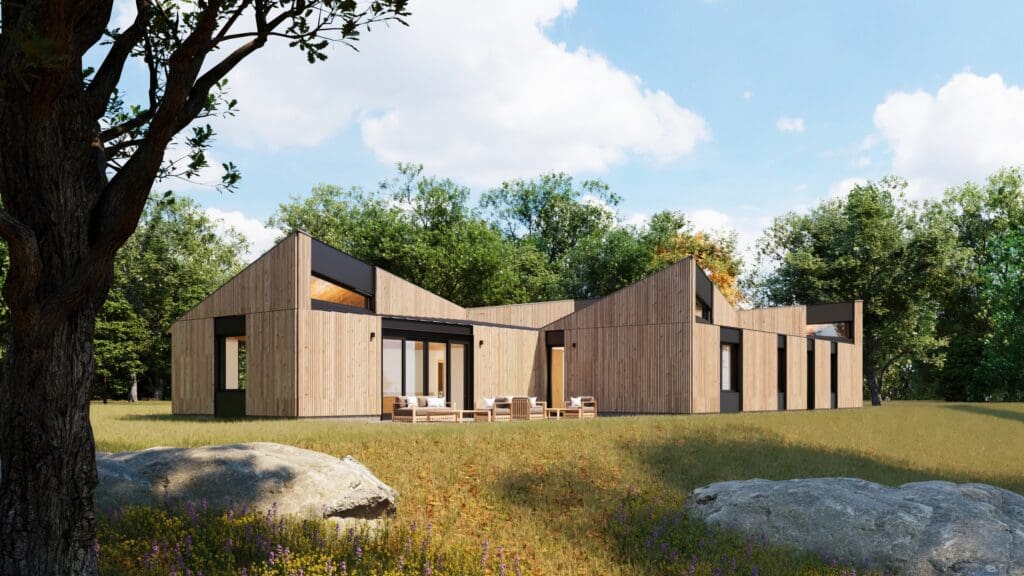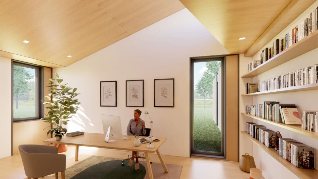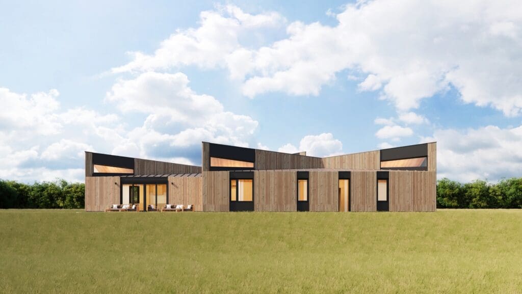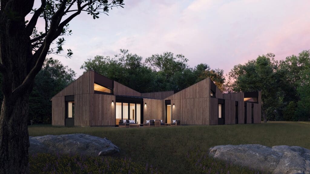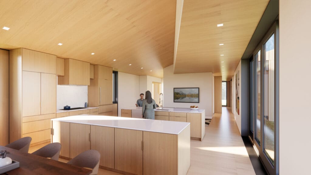 The Offset plan is spacious yet compact in its single-story layout. The geometric simplicity of the plan has two offset bars that distinguish the communal spaces from the private, adjoining them with outdoor rooms and views of the surrounding landscape. Expressed at the exterior by dramatic triangular clerestory windows, the origami-shaped roof creates a dynamic light-filled and airy interior with views to the landscape throughout the home.