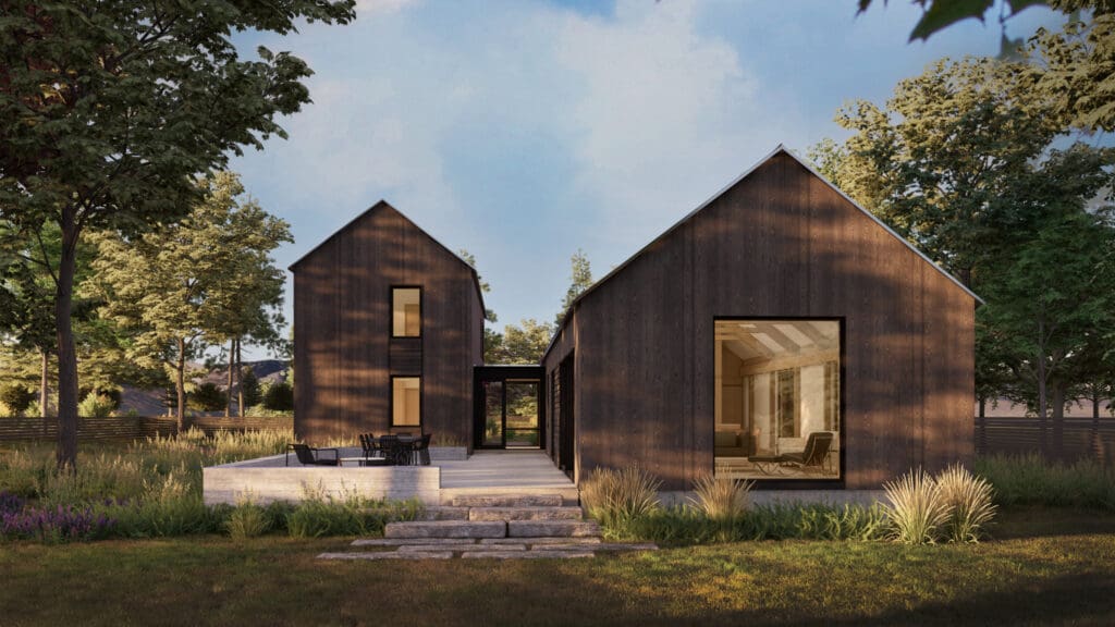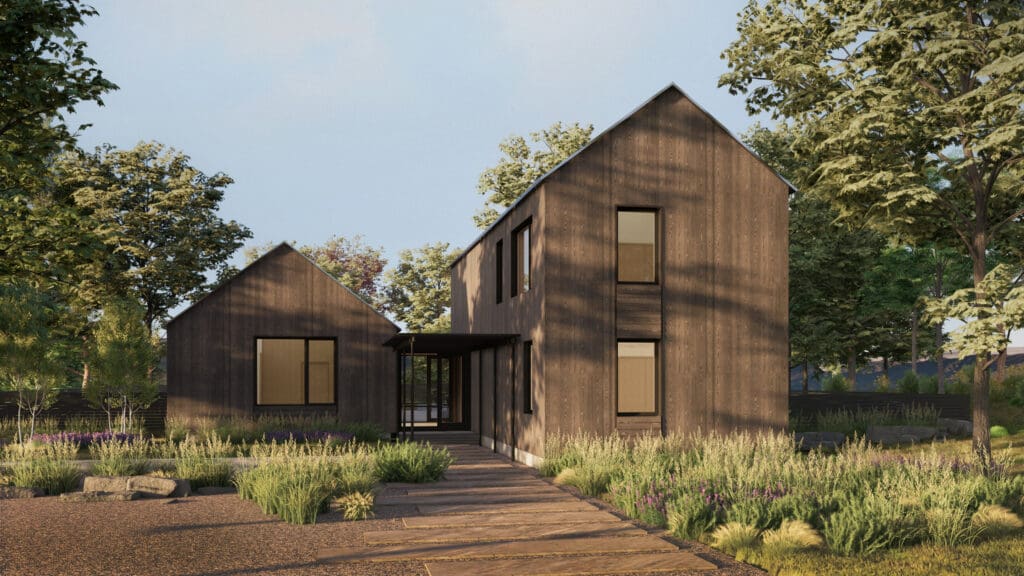 Our largest model, the Sidebar has a vaulted ceiling over the living area with exposed timber frame structure and large glazed openings on all sides that provide a direct connection to the sheltered patio and lots of cross-ventilation. The two upstairs bedrooms are both vaulted and share a thoughtfully compartmentalized bathroom, and the primary suite on the first floor includes a large and daylit bath.