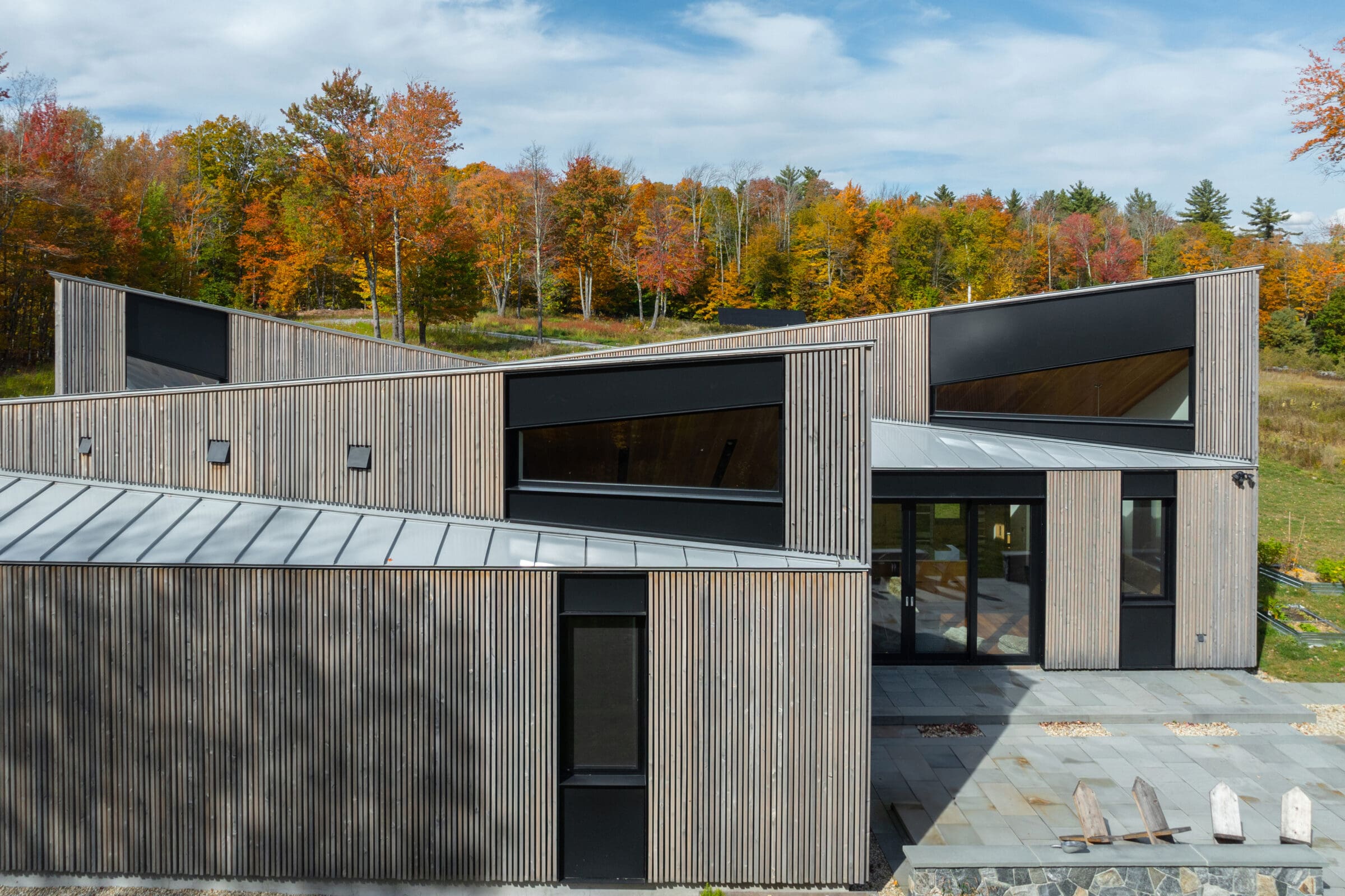 This striking OpenHome design by KieranTimberlake is a single-story residence featuring their signature origami-inspired “butterfly” roof, creating a sculptural form that responds directly to its natural surroundings. The design was carefully guided by sightlines to the nearby pond and mountain range, with the floor plan organized to maximize views and integrate the surrounding woods and fields. Exterior details include variegated rainscreen siding and aluminum window shrouds and trim, while the interior showcases clean, flush-trim finishes. The home is all-electric, including appliances and the mechanical systems, which feature an air-to-water heat pump system. The home seamlessly combines sustainable performance with a distinctive architectural presence.