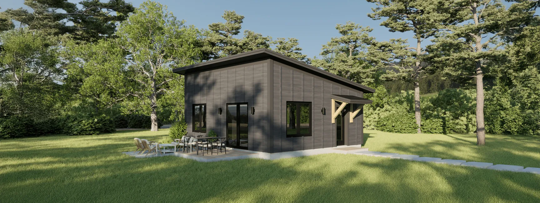 This ready-to-build compact Nano has a mono-pitch roof for a unique, contemporary feel. Enjoy single-level living within its vaulted open kitchen, dining, and living area. The primary bedroom has a roomy closet and sits adjacent to the primary bathroom with a built-in laundry nook. Off the living room is access to the outdoor patio space for relaxing and gathering with friends.