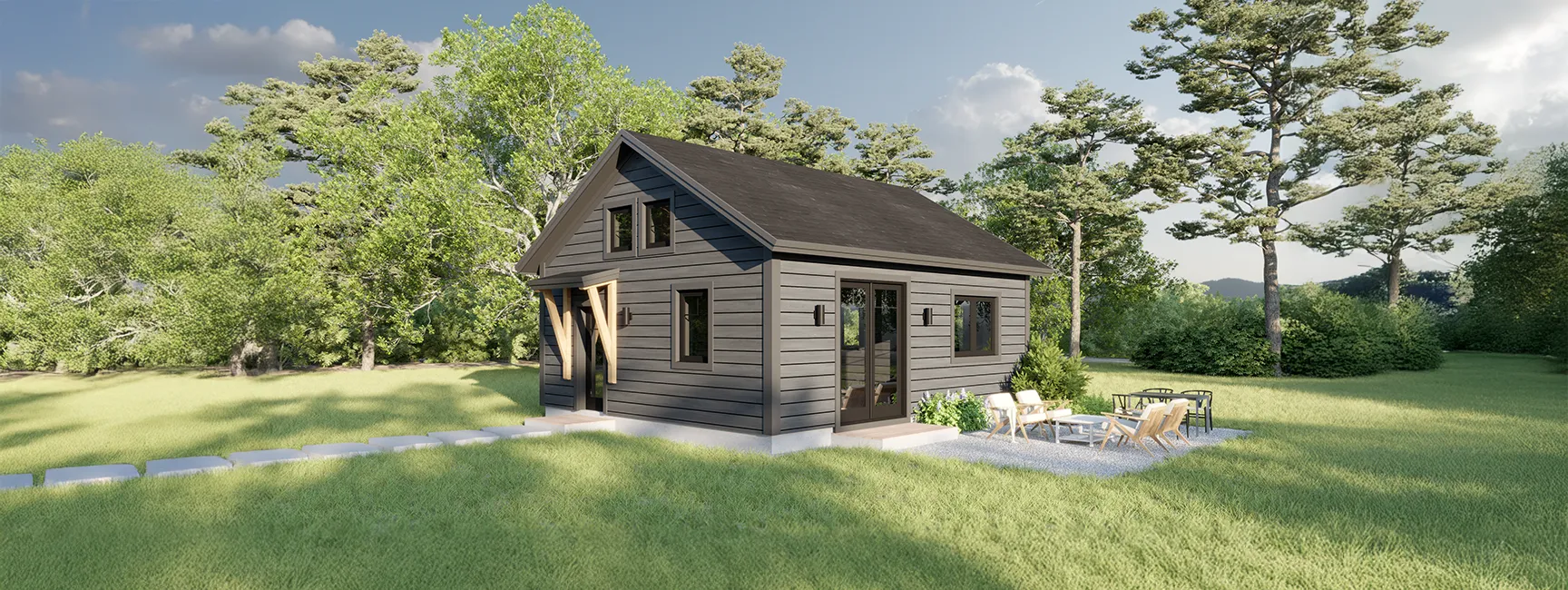This ready-to-build compact Nano has a shallow roof pitch with simple lines and a vaulted living space. Enter through the bracketed entry into the open kitchen, dining, and living area where the kitchen sink overlooks the window for a pleasant view while doing dishes. The first-floor primary bedroom and primary bathroom are off the kitchen and living space. A large, practical storage loft is accessible with a pull-down stair, ideal for all your storage needs.