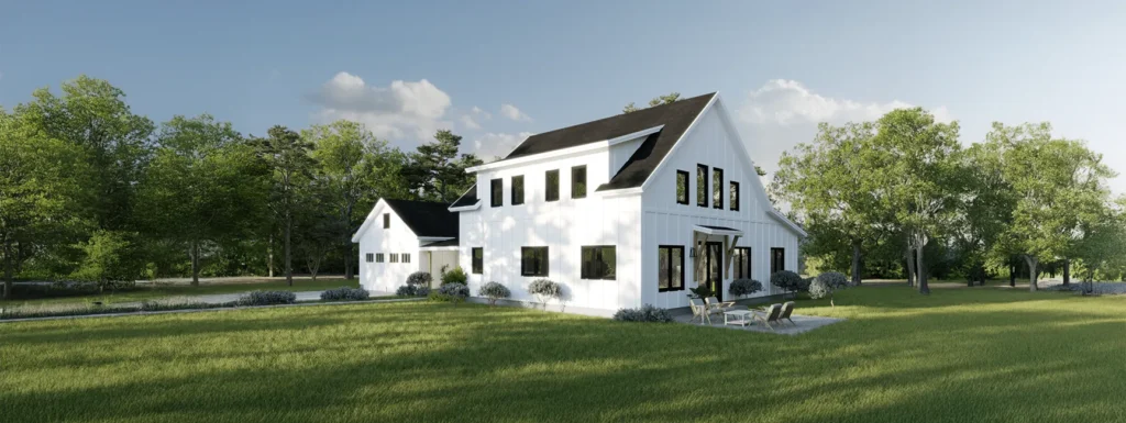 This gable-presenting Tradd has the highest square footage compared with other designs, ideal for families or those who want extra space. The entry porch and connector bridge the garage with the open main floor, containing a first-floor office and laundry area. An open kitchen features a butler’s pantry and informal eat-in counter separate from the formal dining area, a perfect combination for entertaining. For those who prefer single-level living, there is a spacious first-floor primary suite with two extravagant walk-in closets, a changing room, and a sizeable bathroom. Take the switchback staircase to the second floor with dormers, showcasing a unique lookout balcony open below. A recreation room or sitting area is nestled between the secondary bedrooms as a fun hangout space for kids or guests, with an open view to the living room below. The upstairs bedrooms have spacious closets and have multiple windows for a light-filled room.