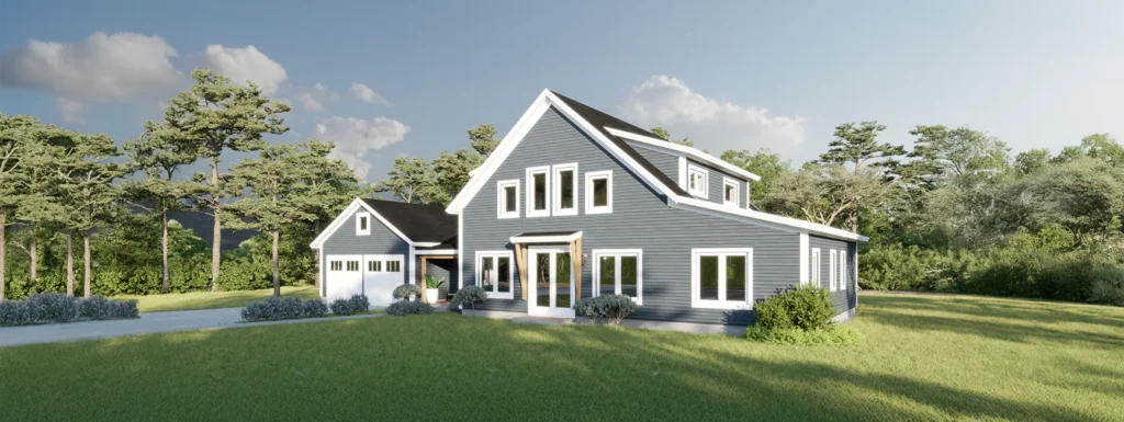 This eave-presenting Tradd has a classic look and the highest square footage compared with other designs, ideal for families or those who want extra space. The entry porch and connector bridge the garage with the open main floor, containing a half-bath and laundry area. An open kitchen, dining, and living area has plenty of space with a substantial walk-in pantry, formal dining corner, and additional breakfast table nook near the kitchen window. For those who prefer single-level living, there is a spacious first-floor primary suite with two walk-in closets, a changing room, and a sizeable bathroom. Take the switchback staircase to the second floor with dormers, showcasing a unique lookout balcony open below. A recreation room or sitting area occupies the corner of the upstairs, down the hall from the three secondary bedrooms.