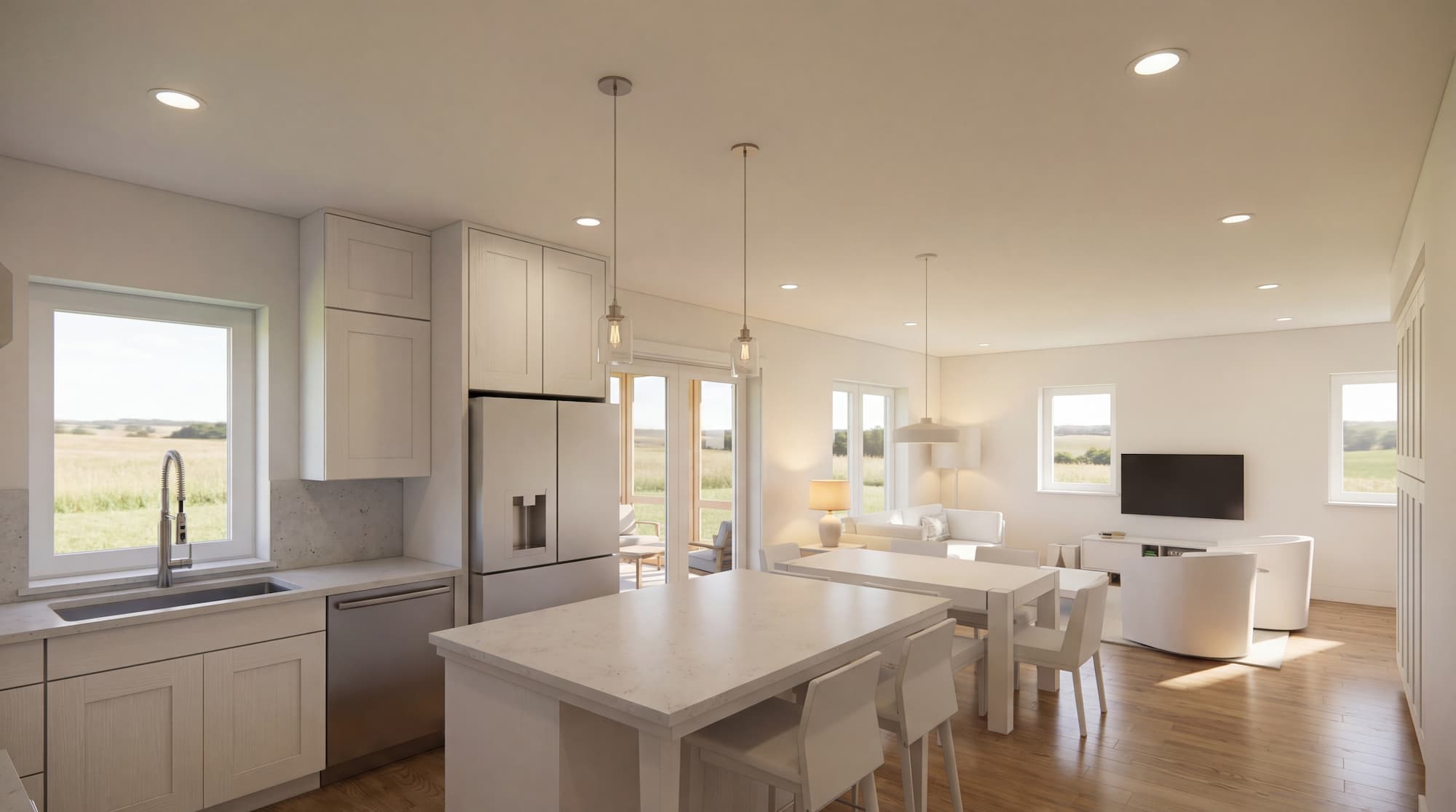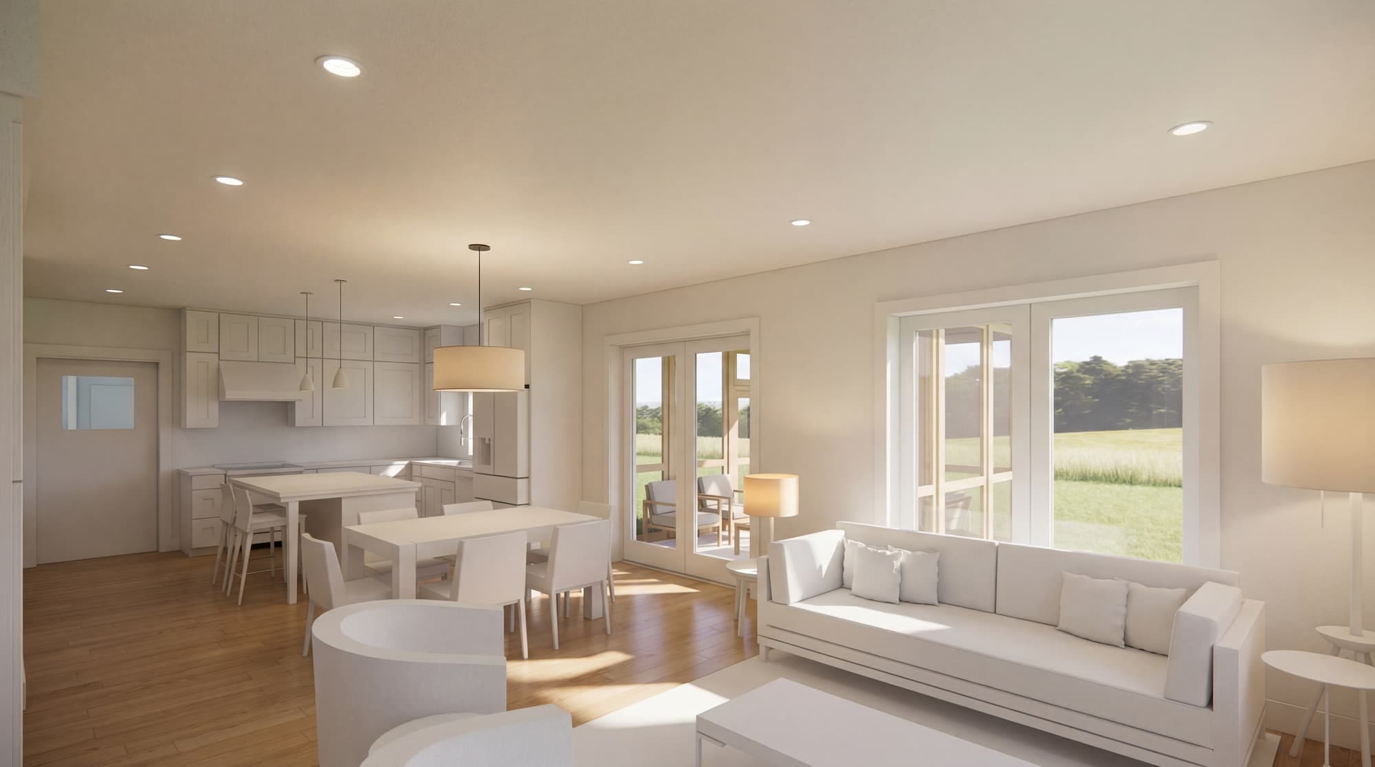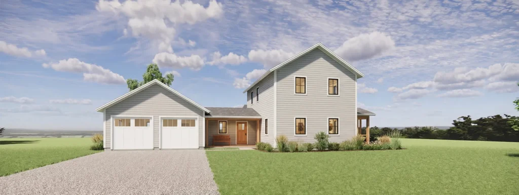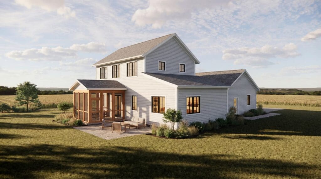 This eave-presenting Värm works well for large families or those who want extra space. Not only is there an addition to the core design and 4 bedrooms, but there is also a garage, connector, screened porch, plenty of storage and pantry space, and a covered porch. Adjacent to the open kitchen, dining, and living area with 9’ ceilings is a three-season screened porch for a comfortable space to gather with friends and family. The first-floor primary suite has additional privacy from the secondary bedrooms upstairs and is close to the downstairs laundry area in the connector. The second floor has a shared bathroom at the top of the stairs, with multiple secondary bedrooms to use as flexible space for kids, guest rooms, or an office.