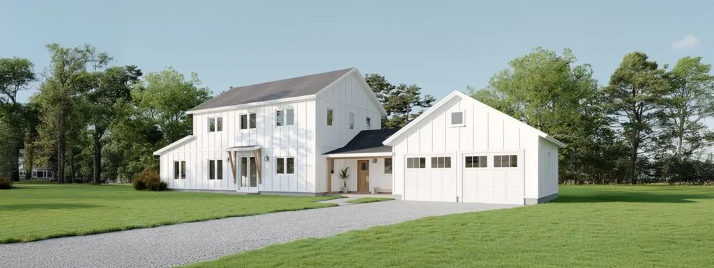 This eave-presenting Värm works well for large families or those who want extra space. Not only is there a sizeable addition to the core design, but there is also a garage, a connector, two porches, and a bracketed entry roof. The laundry area within the entry connector can double as a mud room for easy storage of shoes and coats. The kitchen is equipped with a large pantry, which is adjacent to the open dining and living area with 9’ ceilings and access to a three-season screened porch for a comfortable space to gather with friends and family. The primary suite is on the first floor, with close laundry access and added privacy from the secondary bedrooms upstairs. At the top of the stairs is a spacious shared bathroom across the hall from a versatile sitting area or play nook.