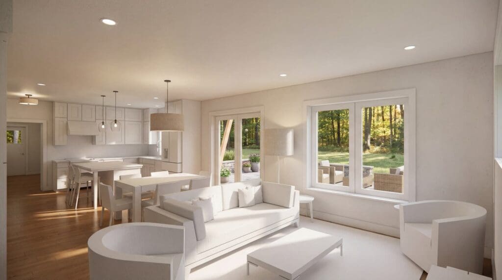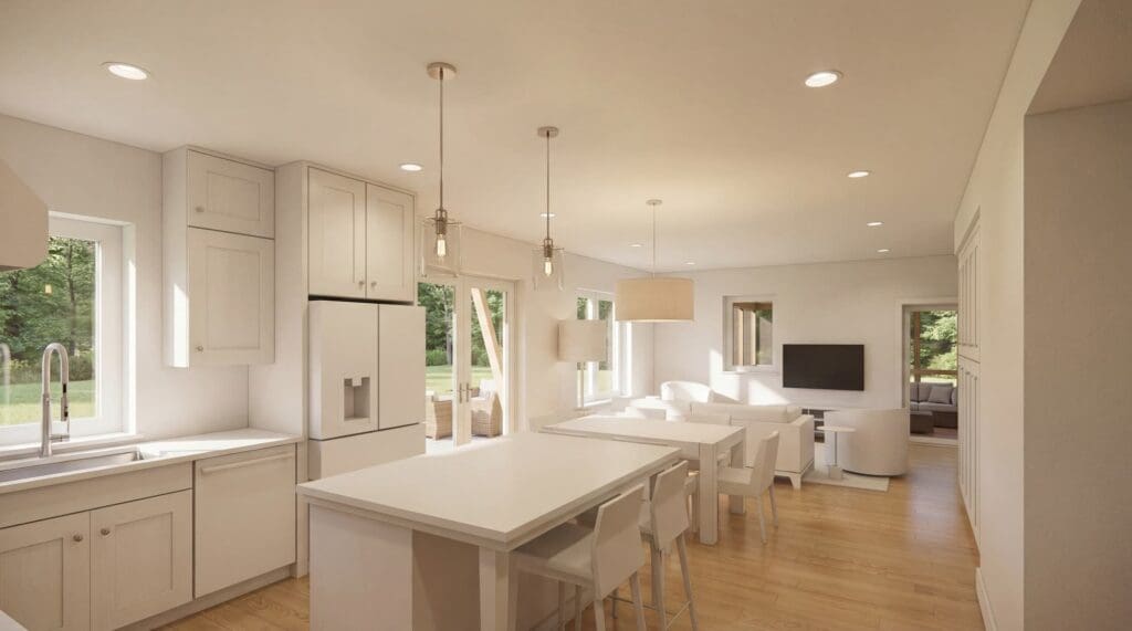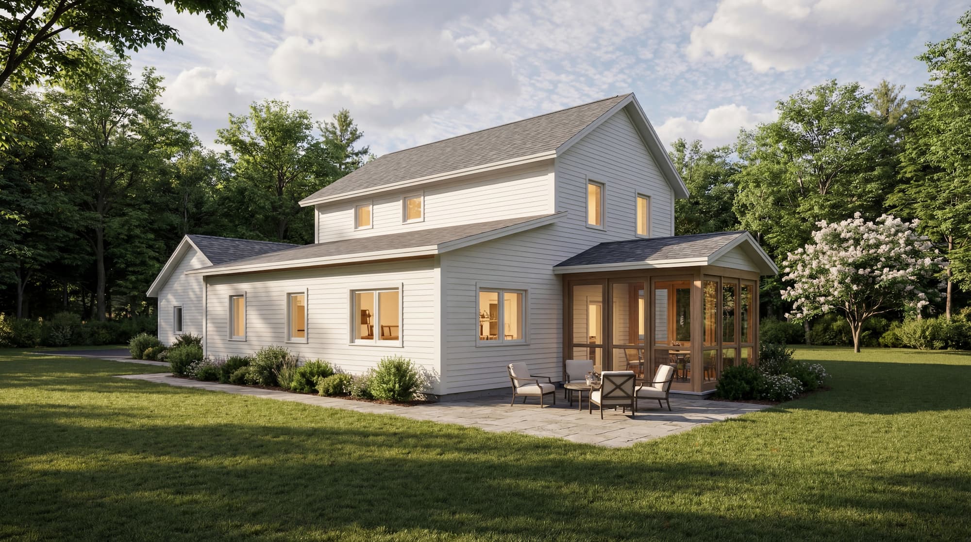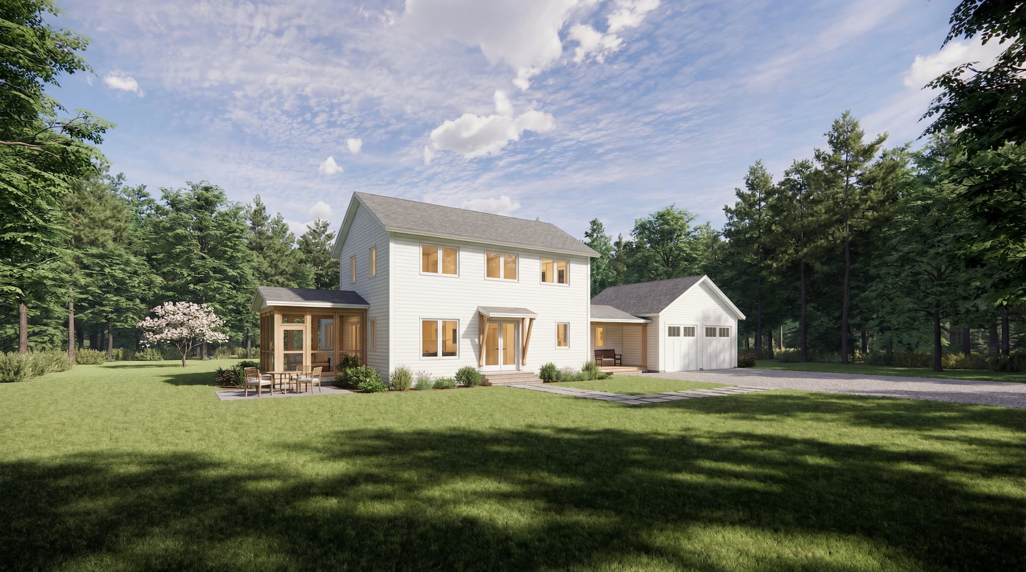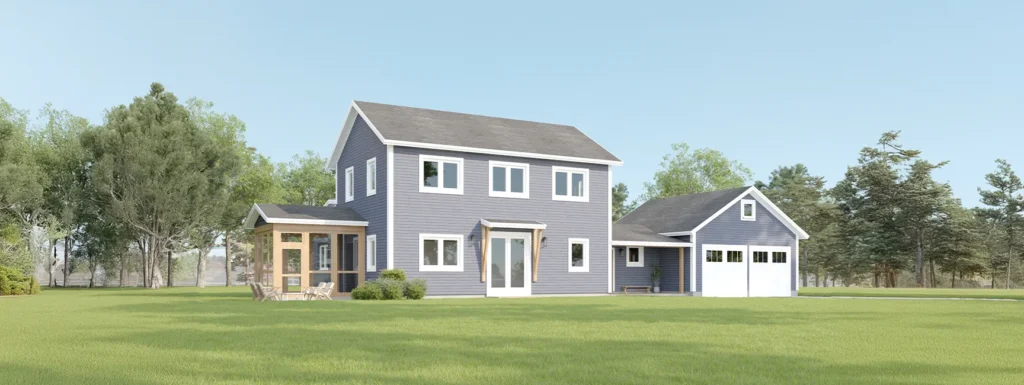 Värm Torsby blends generous living spaces with functional versatility. The open kitchen, dining, and living area with 9-foot ceilings connects seamlessly to a three-season screened porch, perfect for gatherings in any weather. A private first floor primary suite offers separation from the upstairs bedrooms, while the connector houses a dedicated office and storage space. Upstairs, a den between the secondary bedrooms creates an ideal playroom, lounge, or home library. Every detail is designed for comfort, efficiency, and enduring quality.