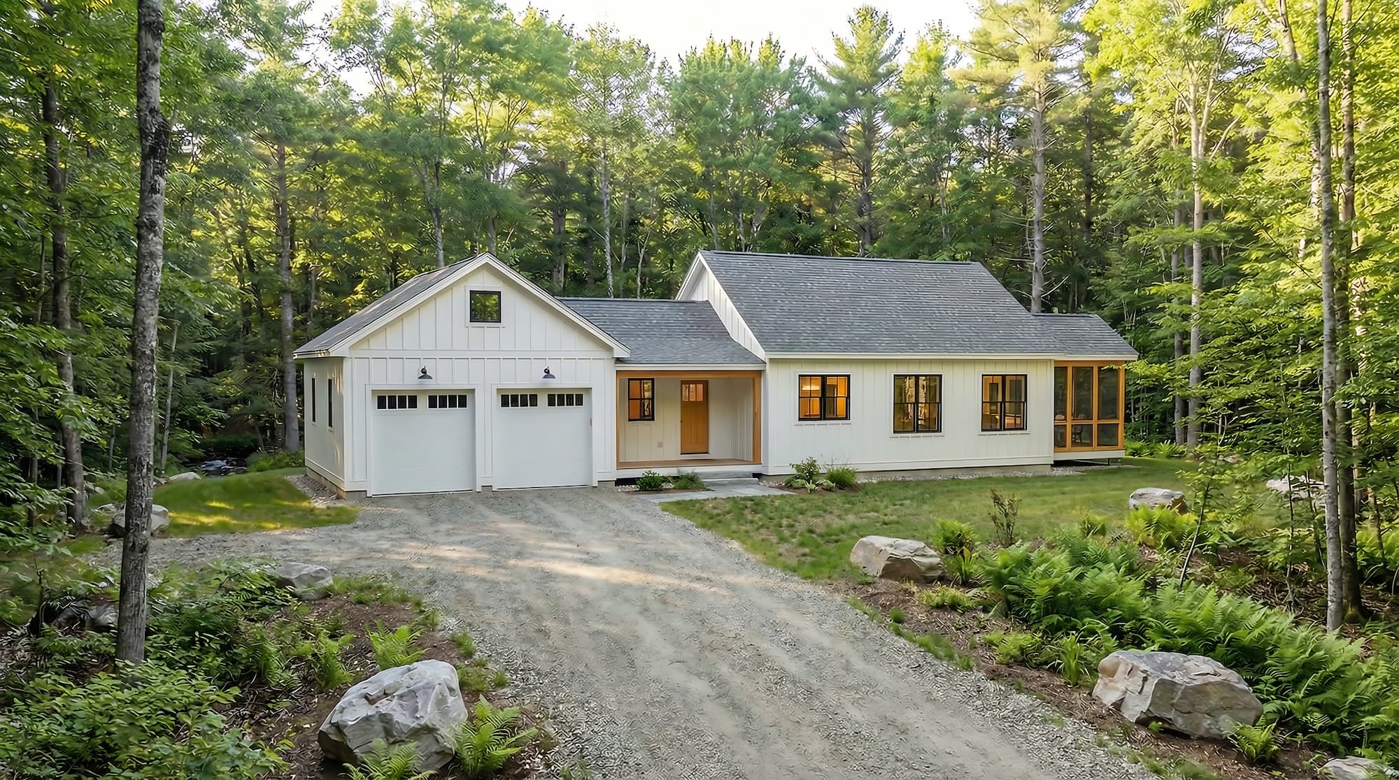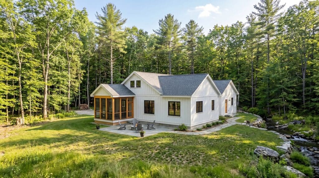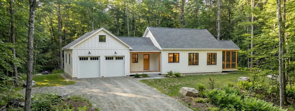 This eave-presenting Xyla has a quaint covered porch leading to the open kitchen, dining, and living area. The interior has vaulted ceilings with a loft and plenty of built-in storage. The living room leads into a three-season screen porch, providing an additional gathering space for family and friends. The vaulted primary bedroom is separated at the far end of the hallway, with a spacious bathroom and window-lit closet. The two secondary bedrooms share a centralized bathroom across from the laundry area, making single-floor laundry a breeze.