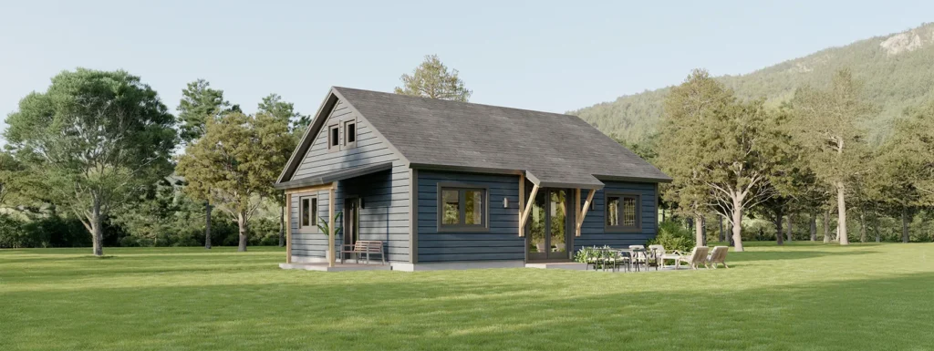 This gable-presenting Xyla has an endearing design well-suited as a starter home or second home. The covered porch and side yard bracketed entry add functional charm to its exterior. With a loft running parallel to the ridge, there is plenty of room for storage or to use as a versatile bonus space. The open kitchen, living, and dining areas have a vaulted ceiling and exposed timbers under a single eave. The primary bedroom has two separate closets, sharing a centralized bathroom and laundry nook with the secondary bedroom.