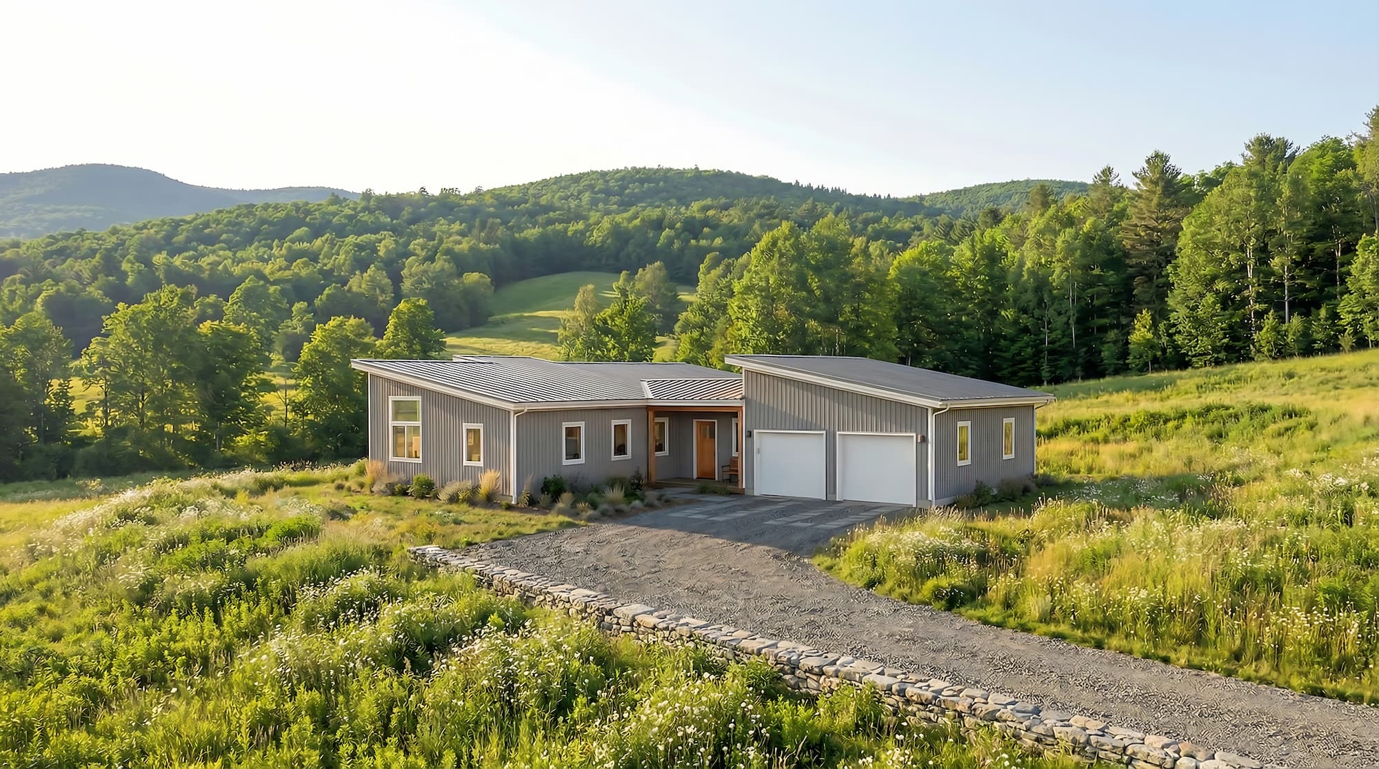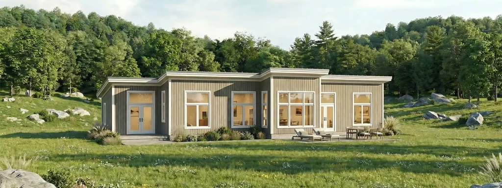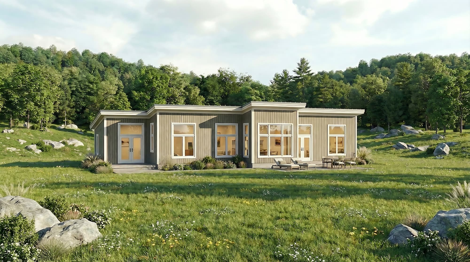 This mono-pitch single-level Zum features an expansive layout, providing views in all 4 of its bedrooms with its large transom windows. Essentially the basic Zum design with multiple additions on either end along with a connector to the garage, this design is popular along hillsides or facing mountainous views. Enter through the covered porch with a laundry room and coat closet which leads to the open kitchen, dining, and living room with exposed posts and timbers, 14’ ceilings, and a modern bump out perfect for a sitting area to admire the outdoors. Each bedroom is close to a bathroom, with plenty of flexible space for family and overnight guests.