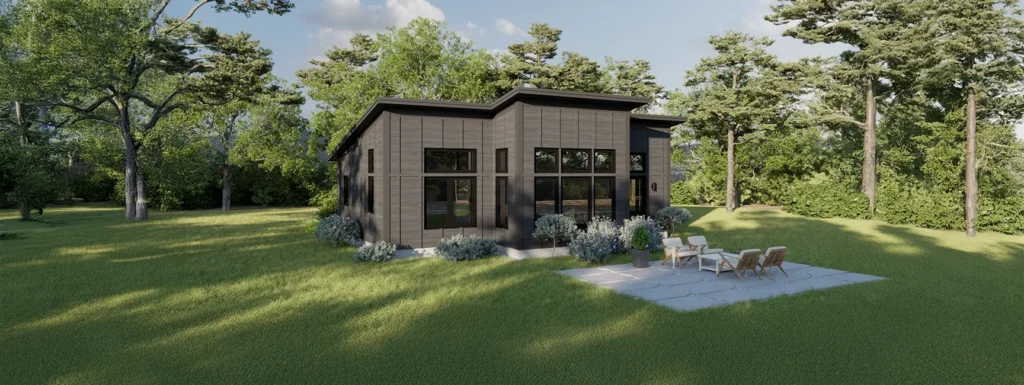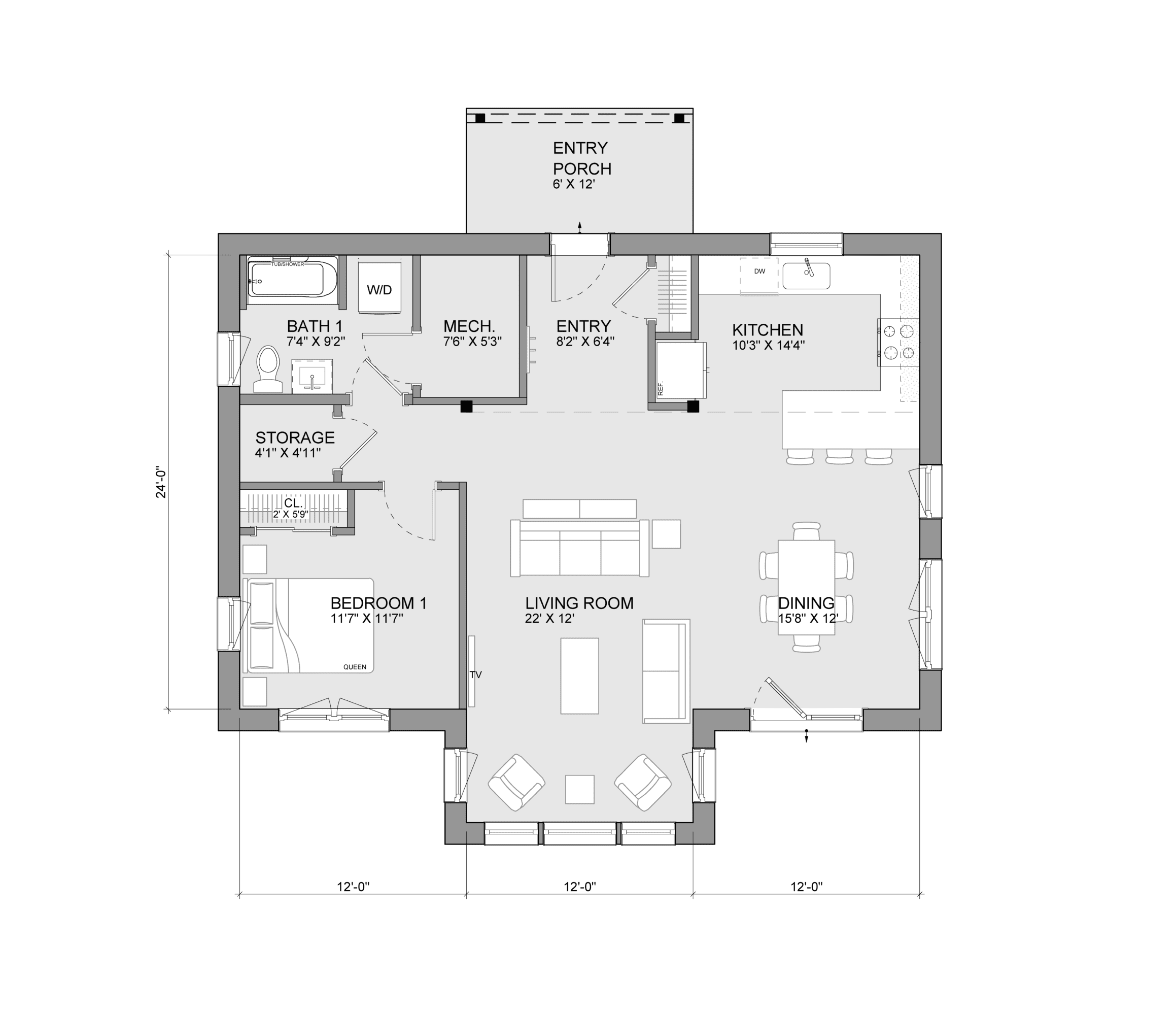 This mono-pitch single-level Zum brings together the best aspects of the Zum into one compact footprint. With its entrance on the opposite side of the large transom windows, this single-level design is ideal for land with a view or on a hillside. Enter through the covered porch into the open kitchen, dining, and living room with exposed posts and timbers, 14’ ceilings, and a modern bump-out perfect for admiring the outdoors. There are light-filled views in both the public area and in the primary bedroom, a feature unique to the Zum, allowing for maximum intake of natural light throughout the seasons. Conveniently located across from the bedroom is the primary bathroom and laundry area, making chores a breeze.