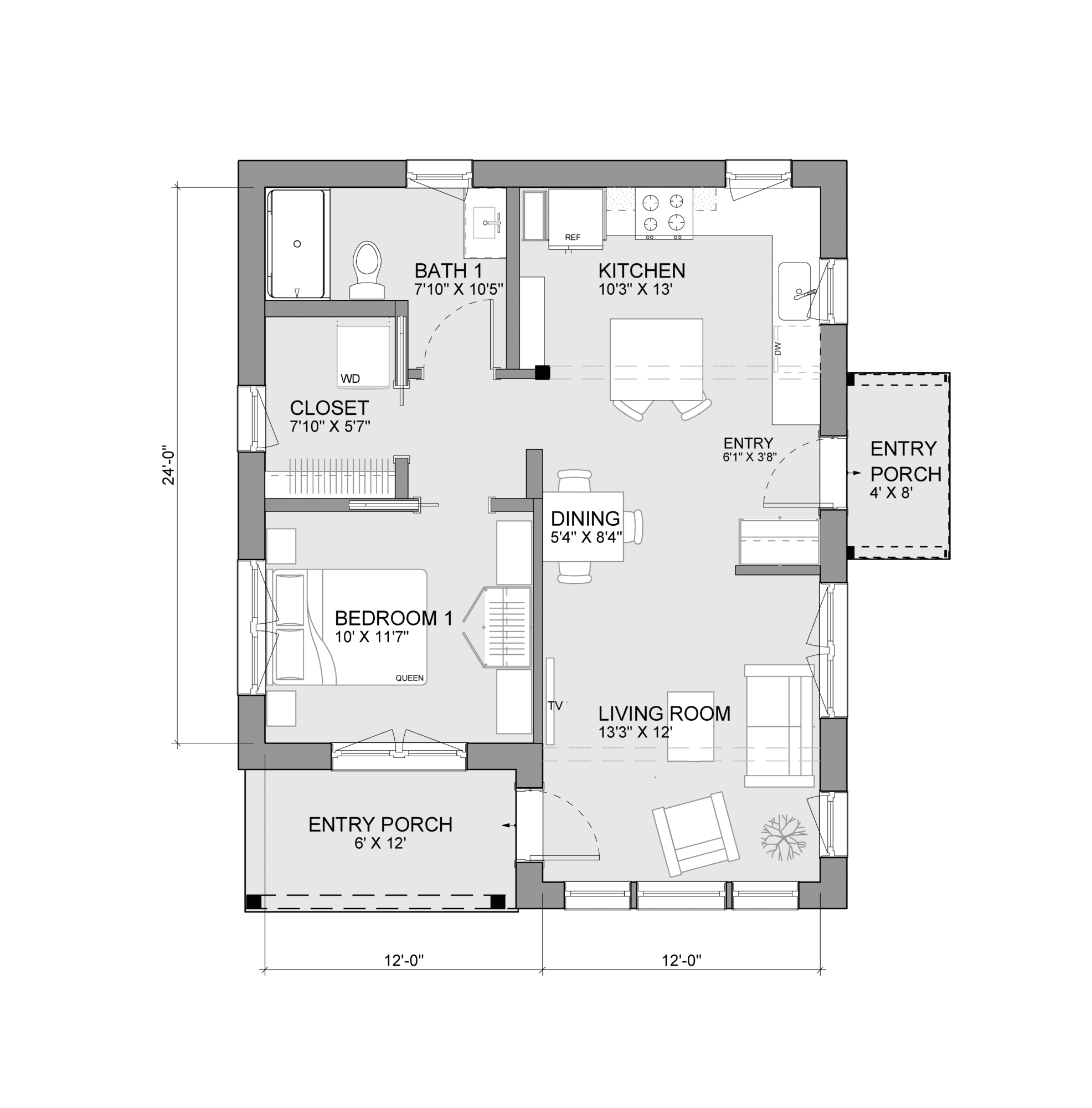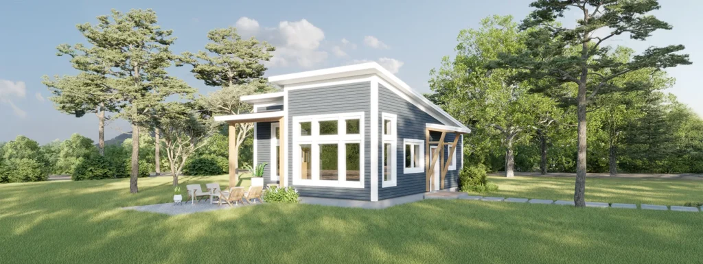 This ready-to-build mono-pitch Zum is perfect for small-home living or a single-level ADU. Enter through the bracketed entry into the open kitchen, dining, and living area with exposed posts and 14’ ceilings. Accessible from the living room is a covered porch where you can sip coffee in the morning and watch the sun rise. Next to the primary bathroom is a large walk-in closet with a convenient attached laundry area and plenty of storage.